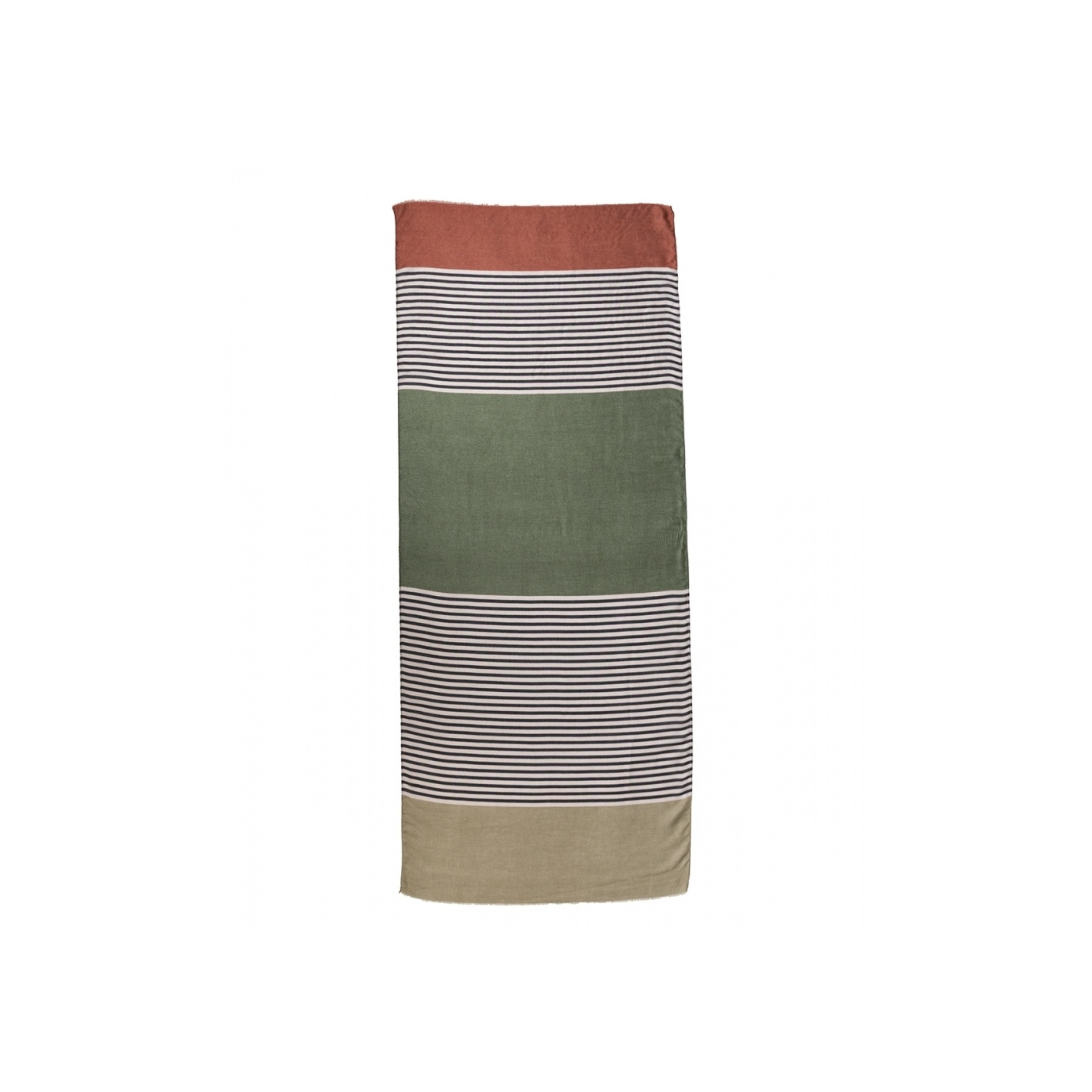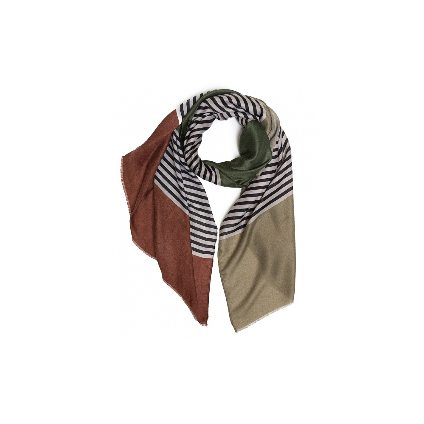 Foulard con dos lados de flecos, dibujo a rayas y franjas de color.